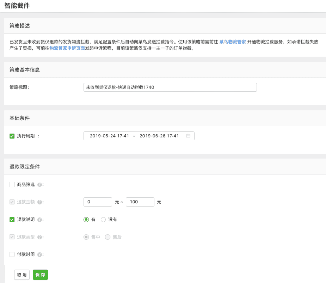 自动拦截策略设置:进入物流拦截策略详情页设置自动化拦截策略(设置周期、商品、退款说明、付款时间、退款原因、买家等级等),对于符合条件的已发货仅退款订单,自动下发拦截指令给菜鸟拦截