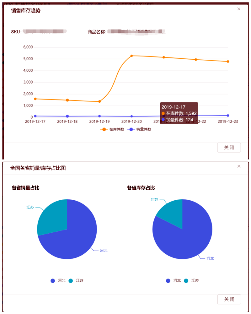 同时SKU还可展示该SKU的销量库存趋势与区域占比