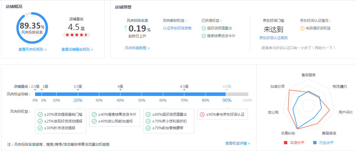 这个的要求是风向标达到90%以上,且各个指标合格。被打上京东好店的标之后,会起到连带作用,对付费推广起到加权,同时好店更让消费者放心,加大店铺的转化率。
