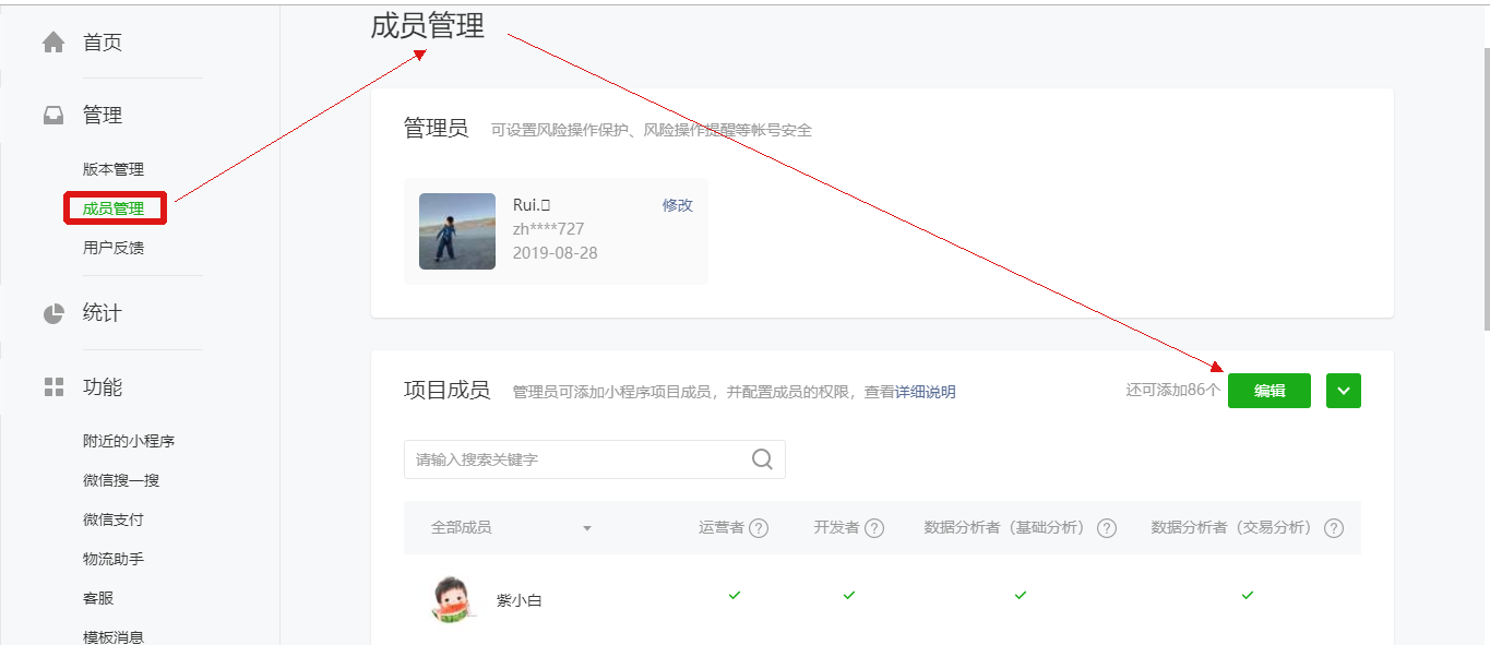 步骤8:添加小程序项目成员;用户身份→添加成员,商家可自行添加运营人员;
