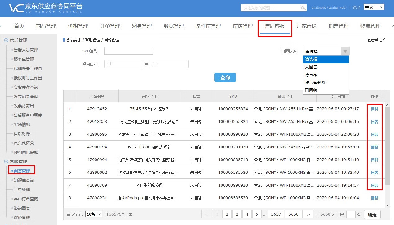 操作简要说明:商家朋友可以在【商品问答】功能里面查看到本店铺内全部问题列表,通过SKU,时间,状态等去筛选出需要回复的问题,筛选出内容可点击“回复/回答”进行答复,同一条问题,不可多次回复,回复完的问题,可以进行查看,已提交的回复内容需进行审核,审核时效为1个工作日,遇到节假日顺延,如遇回复内容驳回,请及时查看驳回原因,并进行内容修改,自营商家和POP商家操作界面,功能类似,内容回复标准相同,商品问题,是必须有用户回复过一次后,才允许商家进行回复,如用户没有进行答复的问题,商家侧无法进行答复,商家回复内容审核标准,(问答规则)商家不得在提问、回答内容中发布违法《京东用户注册协议》,以及其他违反法律法规、监管政策或其他规定的内容,如果用户发布的提问、回答内容有下列情形之一的,审核不予通过展示(包含但不限于以下内容):
