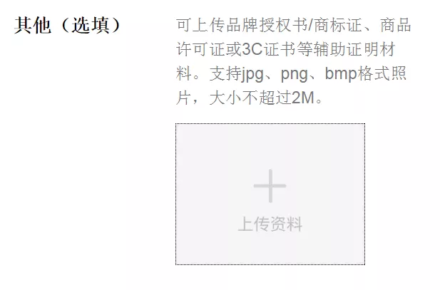 如果售卖的商品类目是代理品牌、自有品牌、电子/电器等品类,可上传品牌授权书/商标证、商品许可证或3C证书等辅助证明材料。