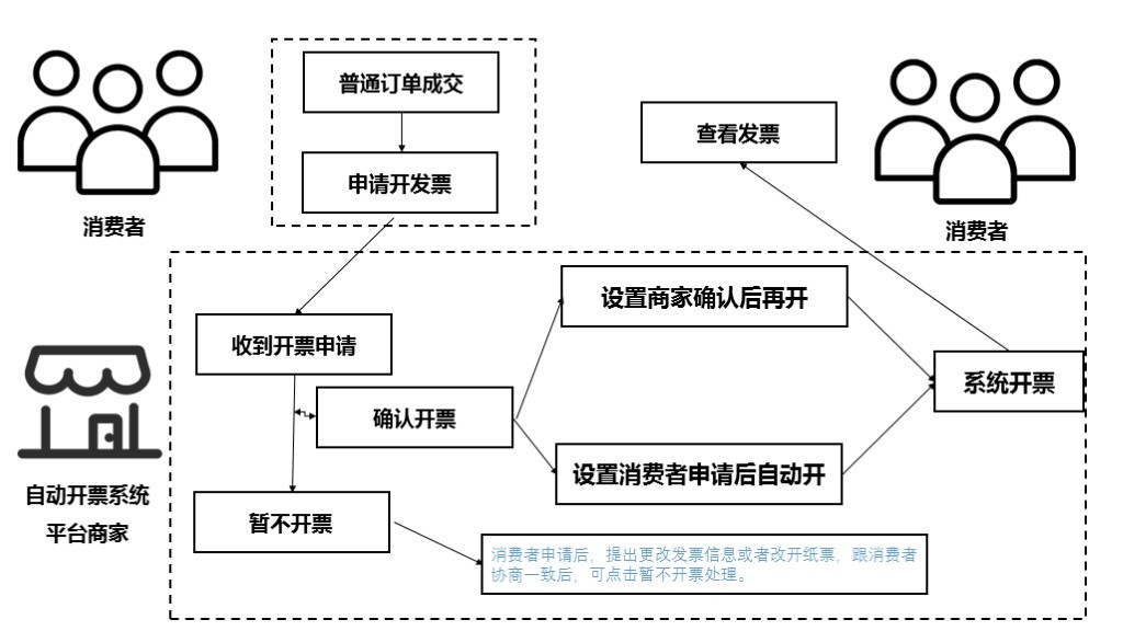 手动开票功能为,消费者未申请时,商家可自行在后台发起申请,申请系统自动开票。