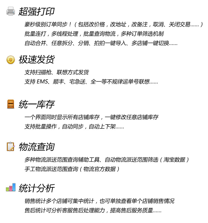集打单发货,库存管理于一体,支持多个店铺同时管理,功能强大