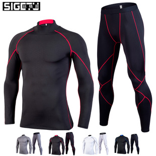 [运动装] 2019跨境新款紧身运动套装男 立领长袖健身服户外高领跑步服装冬
