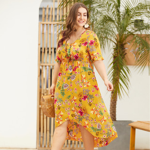 [长裙] 原创设计跨境欧美系带V领短袖高腰前短后长大摆大码女装印花长裙