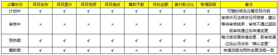 亲,若您众筹项目提交后具体可修改编辑内容详见下表: