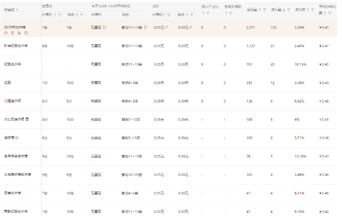 场景三:权重已经起来在做低价引流时,大量关键词以广泛匹配进行推广。经常会发现某天一个关键词流量巨大,降了价以后流量又到另一个关键词上,预算提前花完。如果遇到这样的情况可以用时间折扣来去降价。权重起来以后系统会匹配更多汉量,关键词只是作为一个流量进入窗口,看似流量在“2019年连衣裙”关键词上,在广泛匹配下实质上进来的流量并不这几个字(当然,匹配的流量会和商品以及过往推广的商品有关系,不会乱塞流量)。所以当流量多的时候不要在意是在哪个词上进来的。用时间折扣调整价格控制流量总量即可。