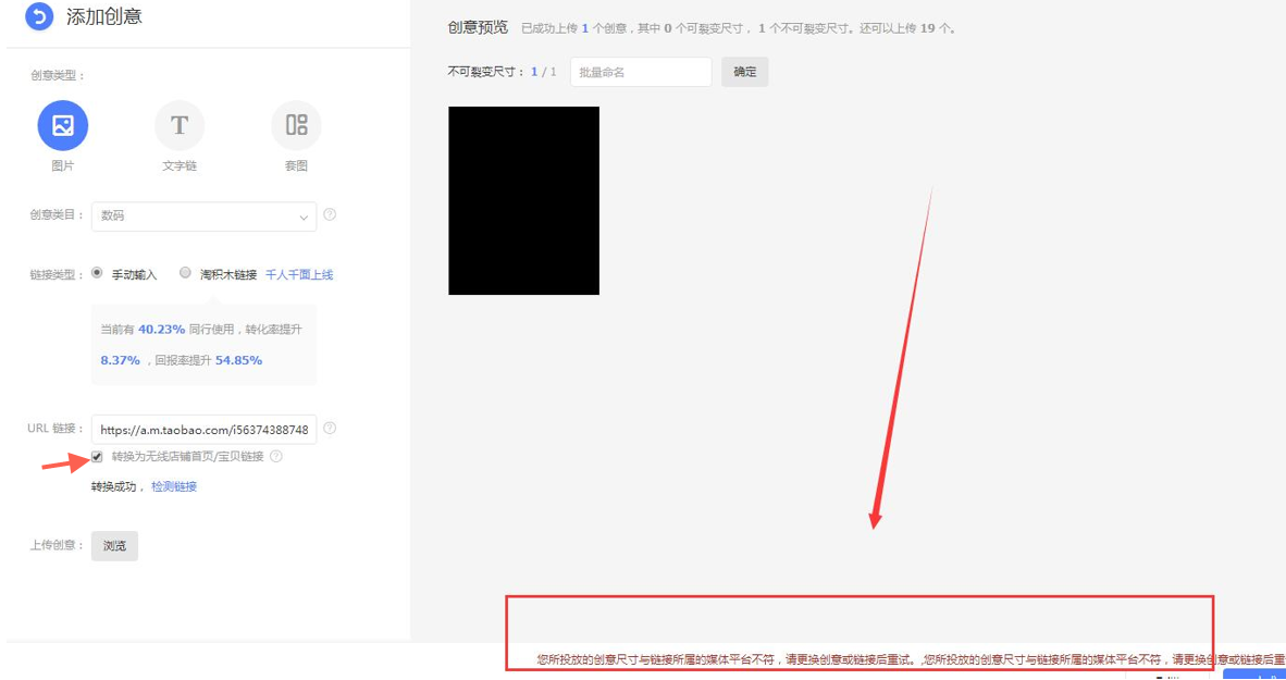 2、若是无线的创意,添加PC的单品或者店铺首页的链接之后,勾选“转换为无线店铺首页/宝贝链接”,生成无线的链接才可投放,或者添加淘积木链接。
