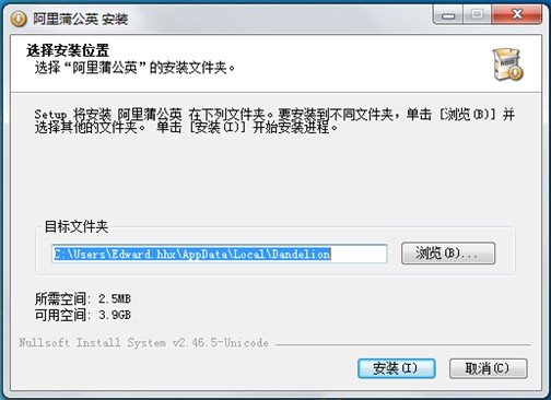 在安装完成(静默安装和界面安装)后,阿里蒲公英的程序【Dandelion.exe】(以下简称EXE)就会安装到用户机器上,接下来就可以启动EXE来创建桌面快捷方式了。