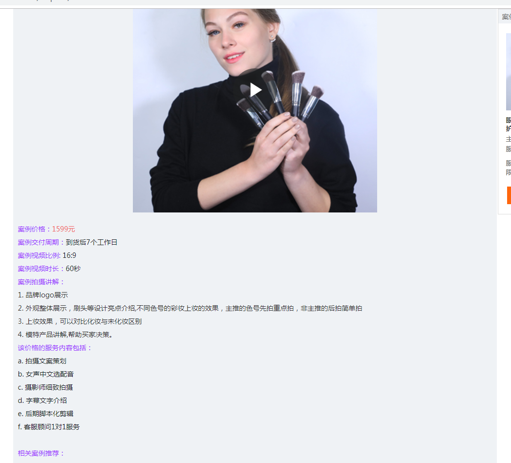 | 服务内容 | 【拍摄文案策划】【不漏脸模特配合】 【女声中文选配音】 【摄影师细致拍摄】 【后期文字介绍】 【后期脚本化剪辑】 【客服顾问1对1服务】 【出片时间7天左右】 |