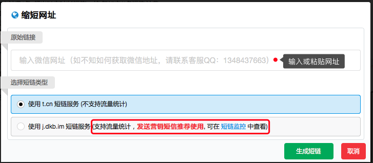 粘贴刚才复制的短网址,根据使用场景选择 短址类型 ,建议 发送营销短信 使用 达客宝官方短网址(dkb.im),可以帮您更好分析流量和转化情况(点击查看短网址流量统计教程)。