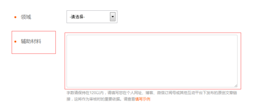 7. 辅助材料:这一栏特别重要。可以填写微信公众号、微博等网址。技巧:申请之前先在微信公众、微博、企鹅号、一点号等连续发文15天左右,一定要原创或者伪原创,然后再把所发文的微信公众号、微博等链接填写到搜狐号辅助材料;
