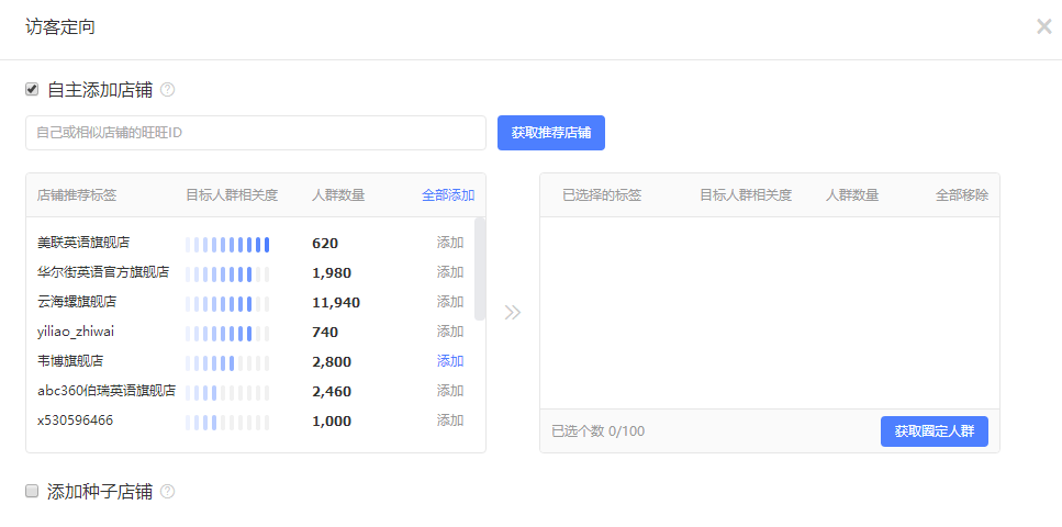 访客定向:访客标签定向主要是投放与店铺人群重合度高的店铺,通过自身店铺访客人群数量、竞店访客人群数量相配合,可以计算出人群重复度,对其进行定向投放,数据效果好的店铺作为重点投放对象。