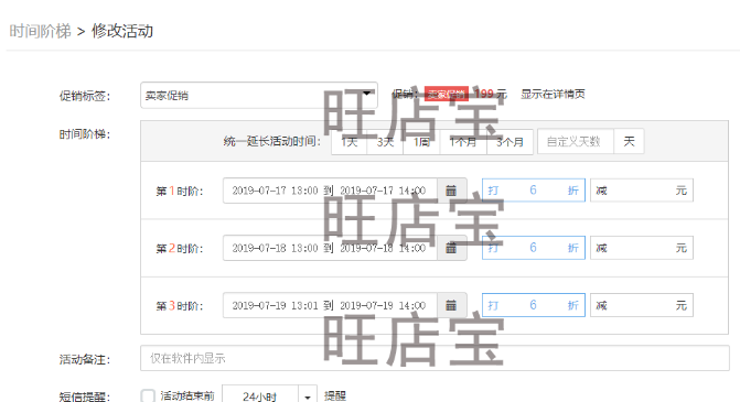 B.设置阶梯价格:和限时促销一样,时间阶梯促销我们也是利用时间营造紧迫感,促使买家尽快下单,这时就需要用到打折工具来帮忙(使用工具:旺店宝)