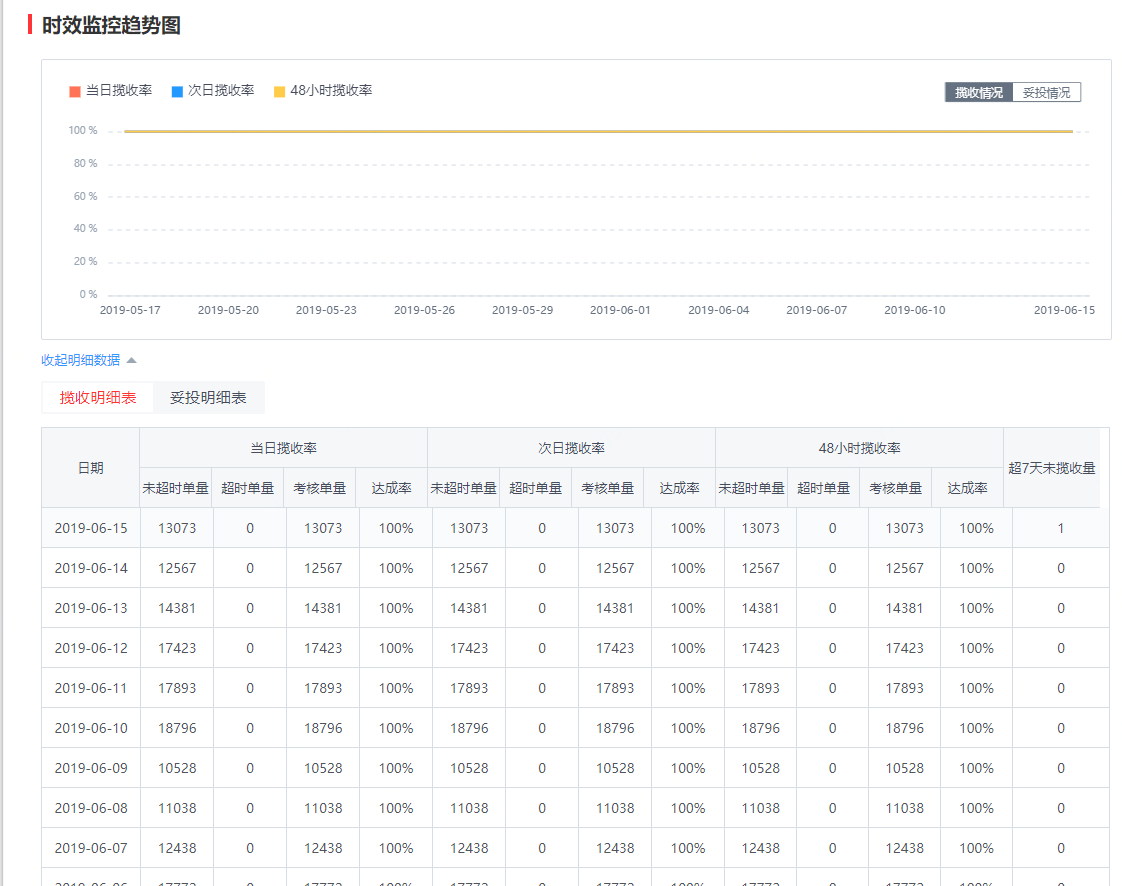 ①时效监控:为商家展示订单揽收及妥投重点指标达成情况(当日揽收率、次日揽收率、48H揽收率;当日达、次日达、隔日达),根据时效达成情况并结合诊断分析页面给出提升建议,供商家查看并快速提升时效履约水平
