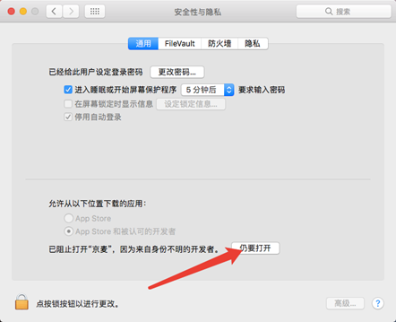 (4)点击“通用”标签项,确认勾选“App Store和被认可的开发者”,点击“仍要打开”;