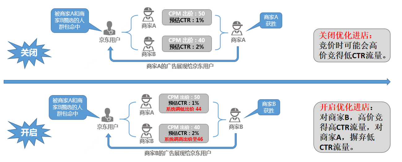 产品逻辑介绍:当某个京东用户被人群命中时,系统实时预估该用户的CTR,对预估CTR较高的用户,系统调高出价。对预估CTR较低的用户,系统调低出价。提升单元整体CTR,降低CPC,从而优化进店
