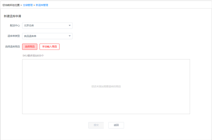 2. 进入到退库单申请页(如下图),选择配送中心、退库单类型(良品退库单和残品退库单);通过选择商品或收到输入商品的形式,选择需要退库的商品