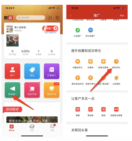 登录微店店长版APP->点击"营销推广"->选择“限时折扣”。
