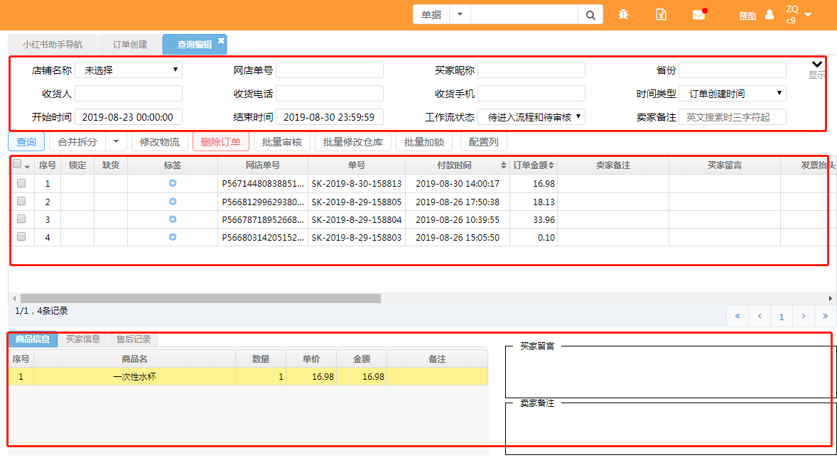 上方为“查询条件和功能按钮区域”,在此可以设置查询的条件,比如店铺名称、买家昵称等来查询需要审核 订单,并进行各项操作;