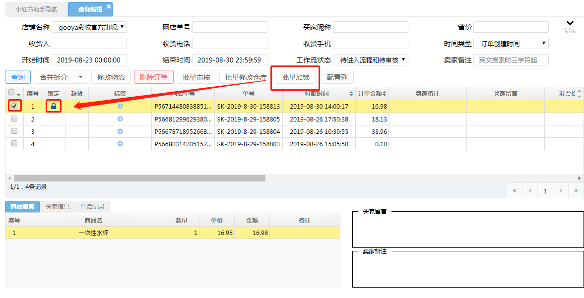 一是在“查询编辑”页面勾选需要锁定的订单,然后点击“批量加锁”即可,锁定后的订单在“锁定”列会 显示一个“锁”的图标,如图2.1.3;