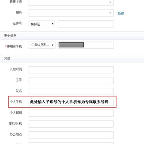 3.在“个人手机”一项中添加手机,此处的号码将作为子账号的专属联系号码。