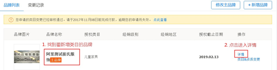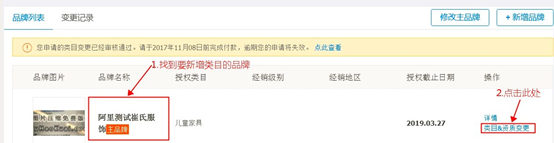 5.返回品牌列表页面,按下图所示进入此品牌的类目&资质变更页面: