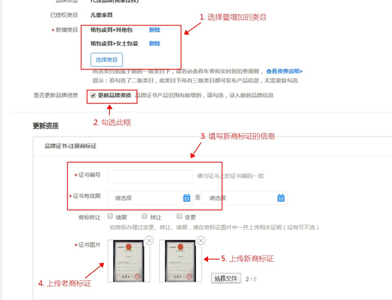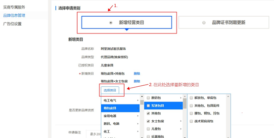 3.图示位置显示的是品牌已有的授权类目。请确认类目不在此范围内。