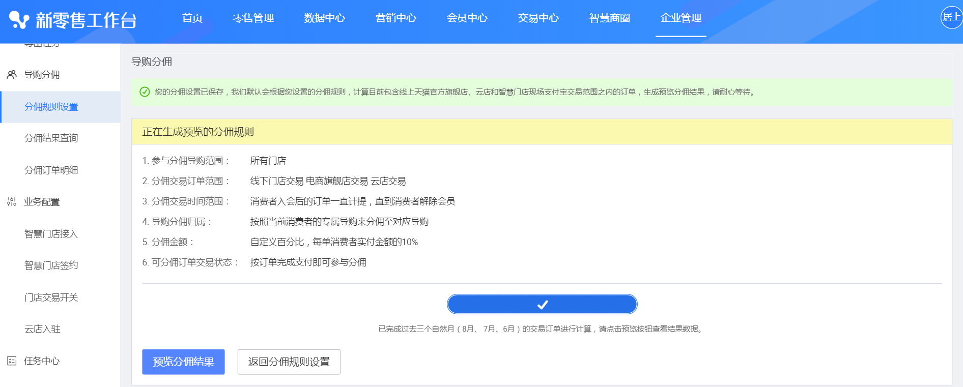 3.初次使用分佣平台时,建议先设置分佣规则,查看预览结果数据,如果预览数据符合预期,再生效分佣规则。如果分佣规则不符合预期,可修改分佣规则,直至分佣结果符合预期后,再生效规则。
