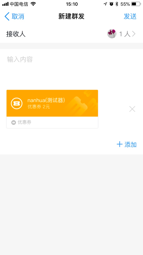导购可针对其维护的会员进行群发营销的动作,操作入口:工作插件“群发助手”-新建群发,选择需要群发的会员名称,添加需要发送的内容(视频,图片,文字,云店商品,会员通用门店优惠券,导购专享门店优惠券,兑换券,口碑券,圈包等)