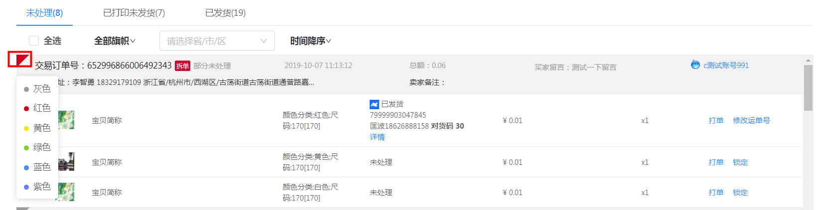 所有订单默认为灰色的旗帜标。选择需要做特殊处理的订单,鼠标放到订单左上角,即可对该订单标上不同颜色的旗帜。页面展示如下: