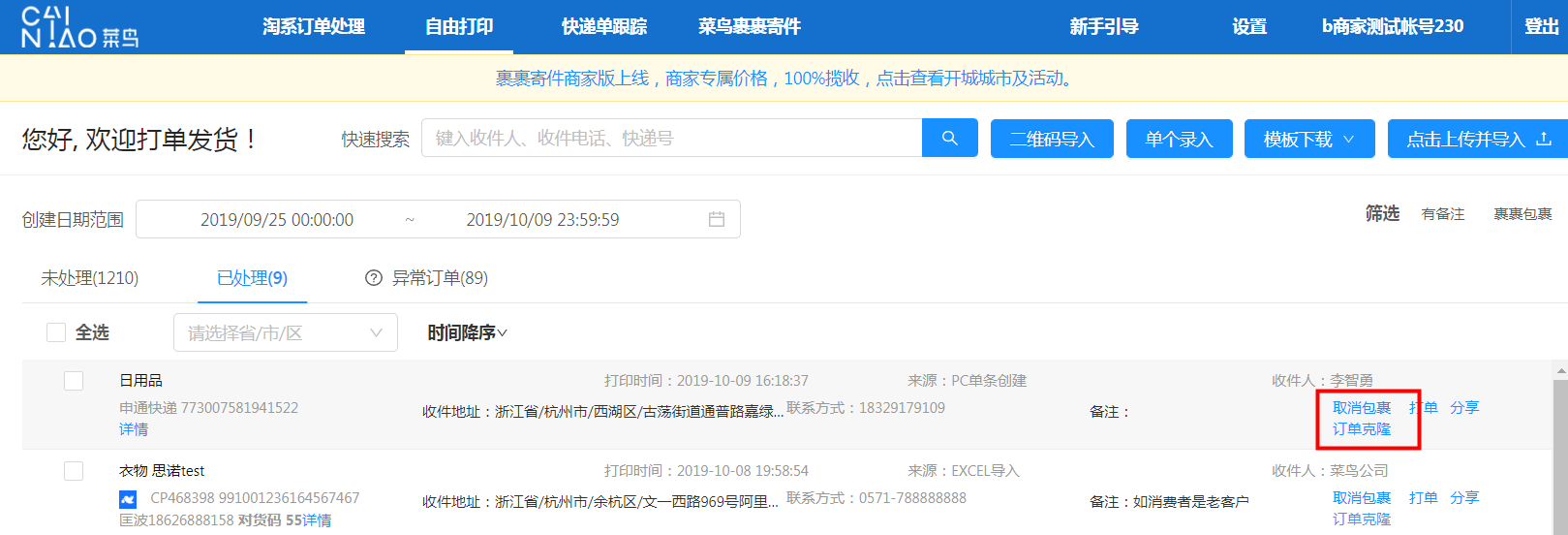 对于已经打印过的订单,可以取消包裹和订单克隆,点击克隆,该条信息会自动复制同步到未处理的订单信息里面。