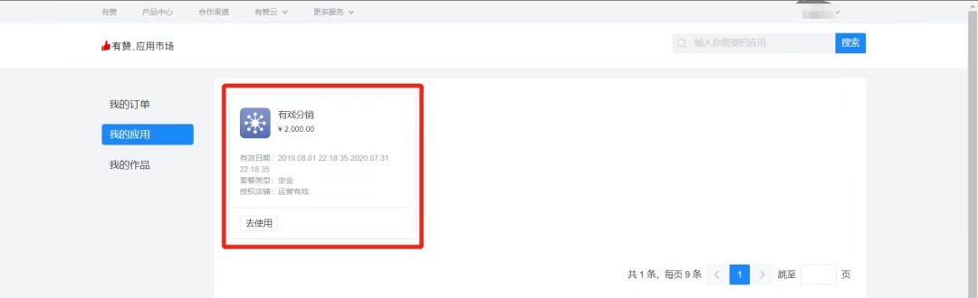 1、在有赞应用市场中,鼠标移入右上角「用户名」处,点击弹出的「个人中心」,进入后点击左侧导航栏中「我的应用」,即可在列表中看到所订购的「有戏分销」应用,点击「去使用」按钮,即可进入。