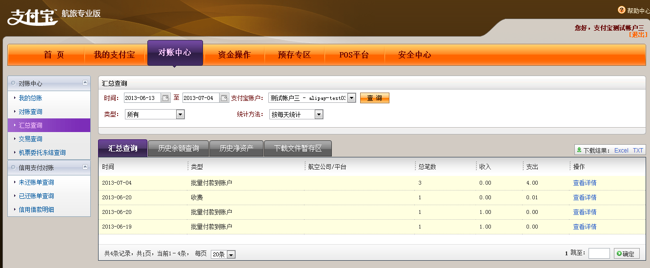 如果选择了按每天统计的方法进行查询,查询结果显示每一天有资金变动的日汇总信息: