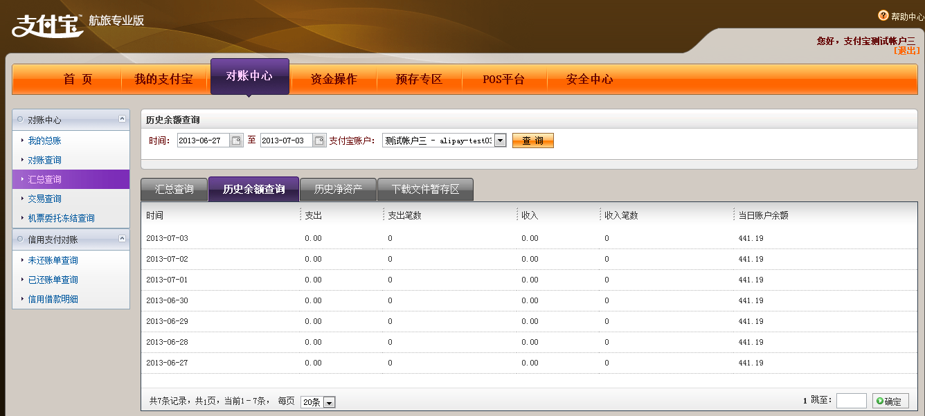三、历史余额查询可查询一段时间范围内账户的余额变动情况。只支持按时间范围查询,默认为当前一周,查询时间不能超过31天;可选择关联账户,默认为当前登录账户。查询结果如下图: