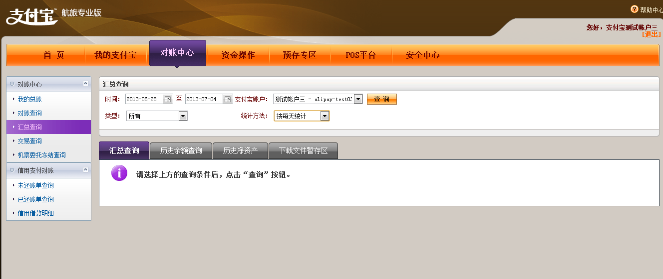 2、默认查询条件:时间默认了当前一周、支付宝账户默认为登录账户,类型为所有类型、统计方法默认为按每天统计。