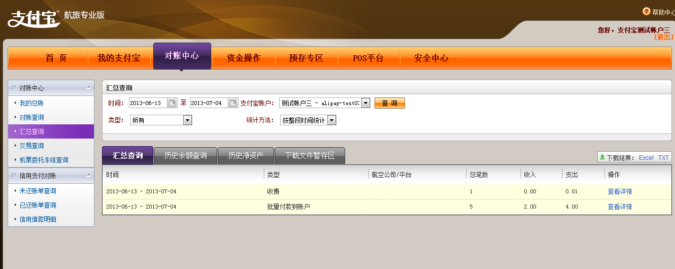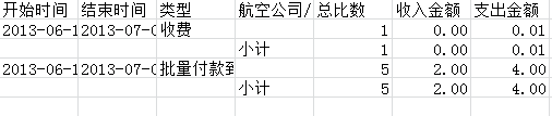 汇总查询结果可选择Excel、TXT两种格式下载,下载文件命名为商户PID_起始日期_终止日期_汇总统计。汇总统计的文件内容为:(按每天统计)