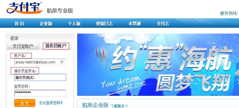 操作员通过“操作员账户”,填写支付宝账户+登录名+操作员登录密码登录。