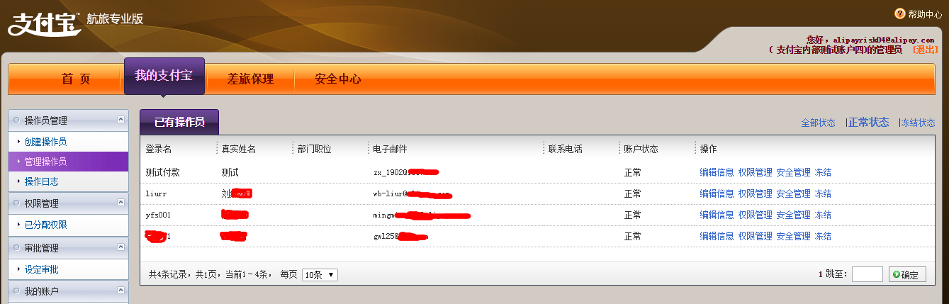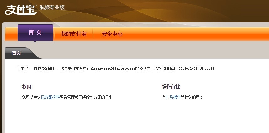 通过签约航旅多操作员产品,可使用航旅版多操作员功能,即一个支付宝账号可以创建多个操作员,为不同的操作员分配不同的功能及权限,方便操作员高效完成各自的任务,并且不能使用其他功能。同时,管理员可以管理操作员所使用的安全产品,进一步提高安全保障。另外多操作员版本还提供给指定功能设定审批的操作,可以满足业务需要多个角色审批的需求。签约多操作员功能后,使用管理员账号登录,即为管理员权限,操作员需使用支付宝账号及操作员账号进行登录,同时为了保证功能统计的有效性及日志查询的客观性,管理员本身不具备任何功能权限,防止日后资金变动出现问题。