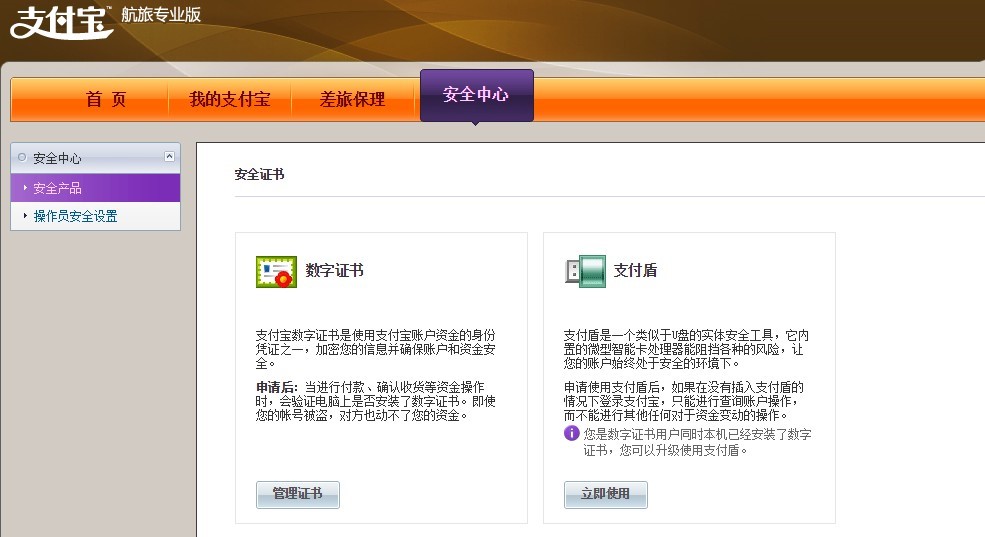 a)安全产品:管理员维护自己的安全产品,包括数字证书和支付盾