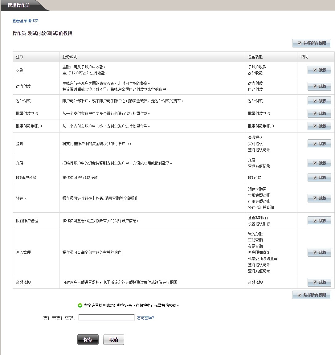 3)权限管理:可以通过该操作管理操作员的权限,给某个已经创建的操作员赋权,权限按照业务所需的相关功能打包组合,即打包赋权给操作员,提高操作效率。