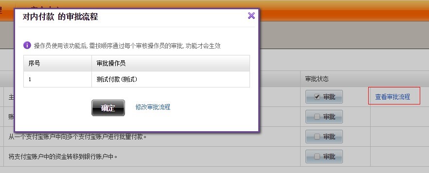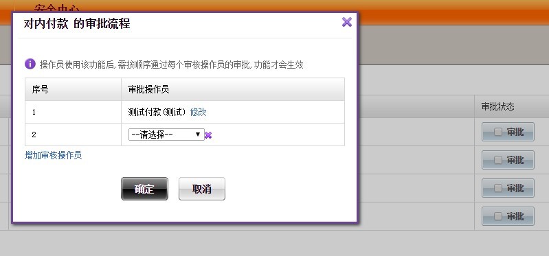 点击“审批”后可以“增加审批操作员”,设置成功后,需要按设置的顺序通过每个审批操作员的审批,业务功能才能生效