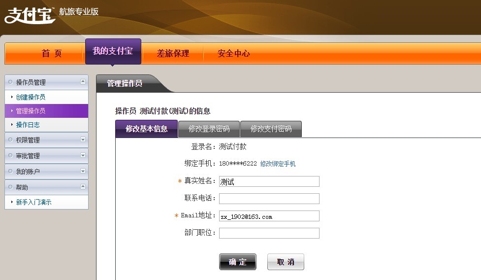 编辑信息:可以通过该操作来修改操作员的基本信息,登录名不可修改。