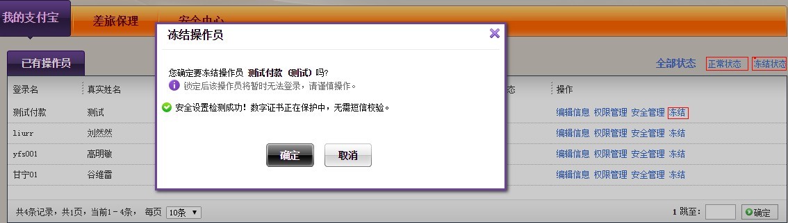 冻结:管理员可以操作冻结操作员,也可以解冻;当操作员数量较多时,可以通过正常状态、冻结状态进行筛选