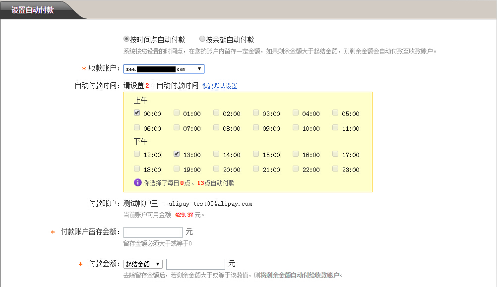 1、自动付款的概念按设置时间或监控余额不足,将账户余额自动付款到绑定的账户。主子账户均可设置自动付款。