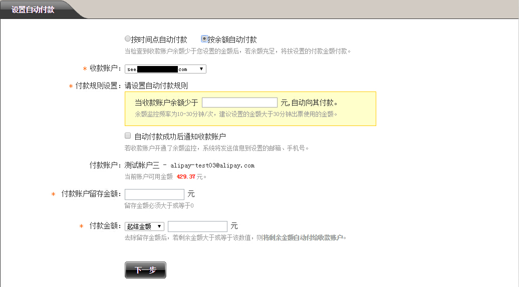 按余额设置自动付款,设置页面如以下截图。选择完设置后点击下一步输入支付密码,确认即可。