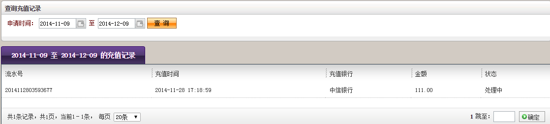充值后,可在“查询充值记彔”页面查看充值记彔,包拪充值的时间,银行,金额,状态;