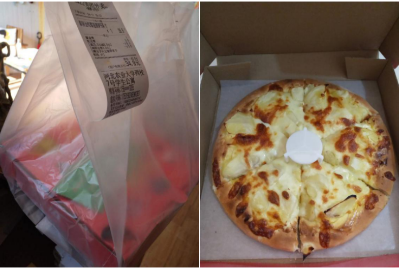 贾云龙以顾客为中心,还体现在其他细节服务中。据他所述,之前他一直用普通的塑料袋,但偶尔会有打翻的情况,虽然这样的状况不多,但十分影响顾客体验,再怎么仔细叮嘱骑手拿平,结果也差强人意,所以改造成了现在的平底袋子(如下左图)并且为了避免披萨被挤压,还置入了有专门的支立架,别看这个小小的动作,这让他有了4.9的商家评分(5分为满分)