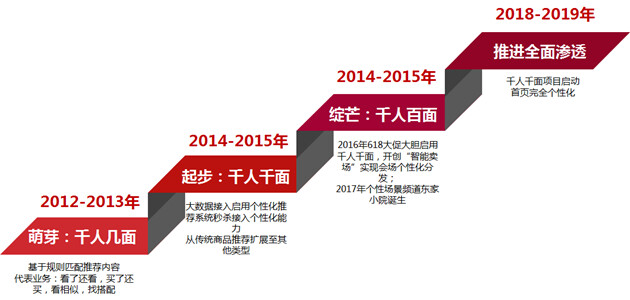 京东的千人千面从12年开始酝酿,一共经历了四个阶段,每个阶段都会产生一些具有代表的业务或频道:2012-2013年的萌芽期,代表业务如看了还看、买了还买、看相似、找搭配等;2014-2015年的起步期,代表业务如秒杀接入个性化;2014-2015年的绽芒期,产生东家小院频道等;2018-2019年的全面渗透实现首页100%的BI化。